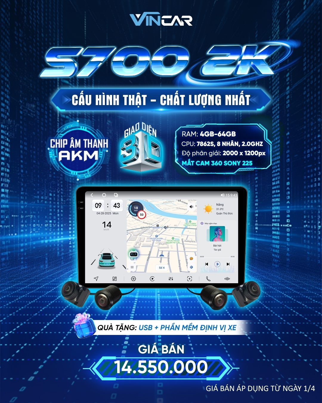 Màn hình Android Vincar S700 Pro 2K 360 là một trong những dòng sản phẩm nổi bật trong phân khúc hiện nay. Với màn hình QLED 2K sắc nét, tích hợp camera 360, chip xử lý mạnh mẽ cùng nhiều tính năng thông minh, đây là lựa chọn lý tưởng cho những ai muốn nâng cấp toàn diện chiếc xe của mình.